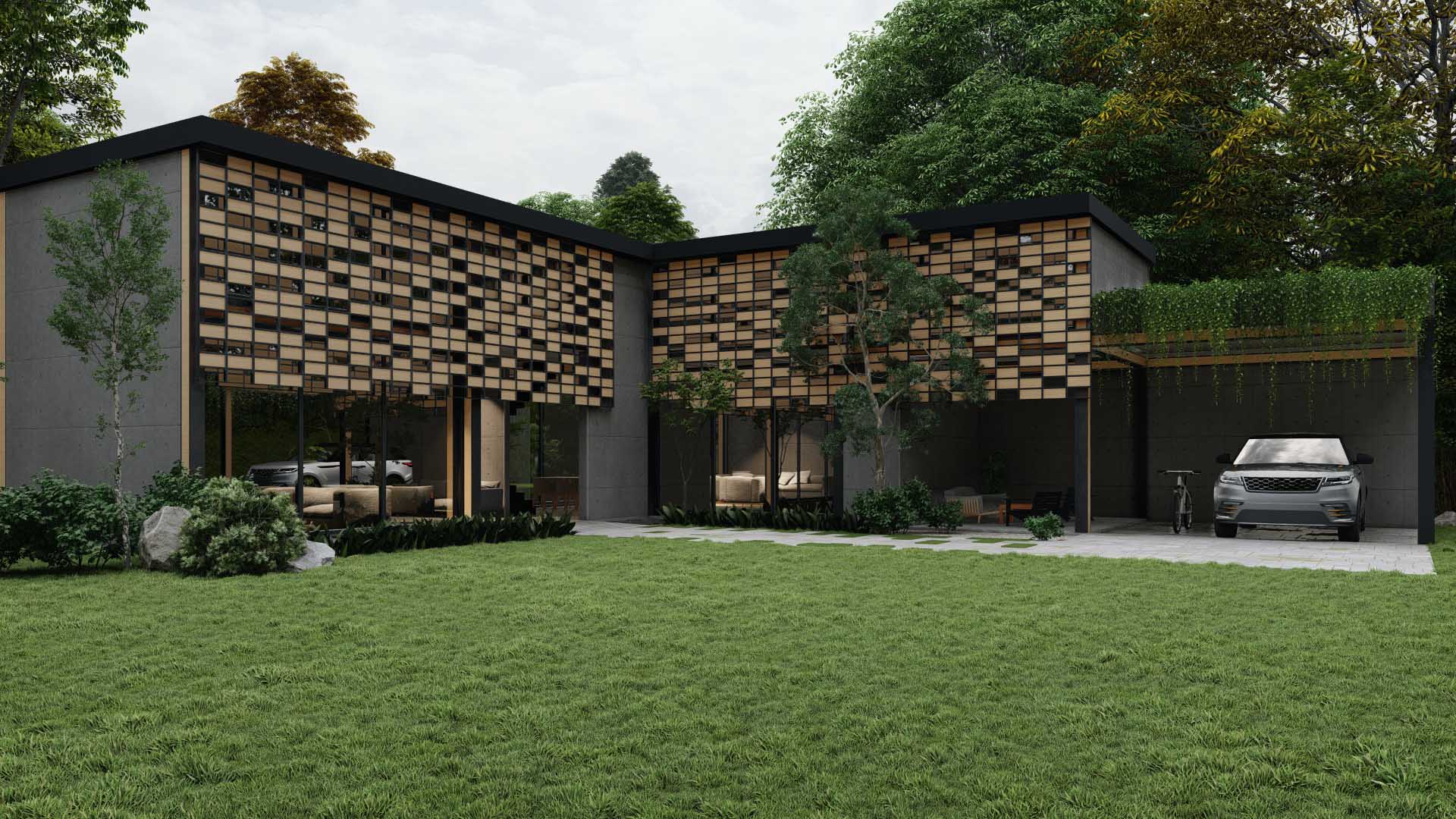 We came up with a concept for a 3,500 sq. ft. single-family house located in Gasquet, California. To maximize the use of the open space, the location of the family room and living room are designed to bring the outdoors inside of the house. The building layout is L shaped, the ceiling is 14 feet high, and the honeycomb façade is made of metal framing that would have glass and wood panels.